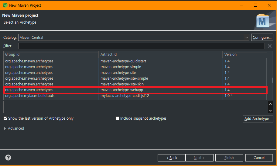 3. Group Id는 'org.apache.maven.archetypes'를, Artifact Id는 'maven-archetype-webapp'을 선택합니다.