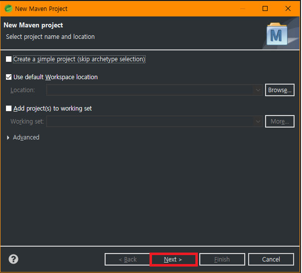 2. New Maven Project창에서 next버튼을 선택합니다.
