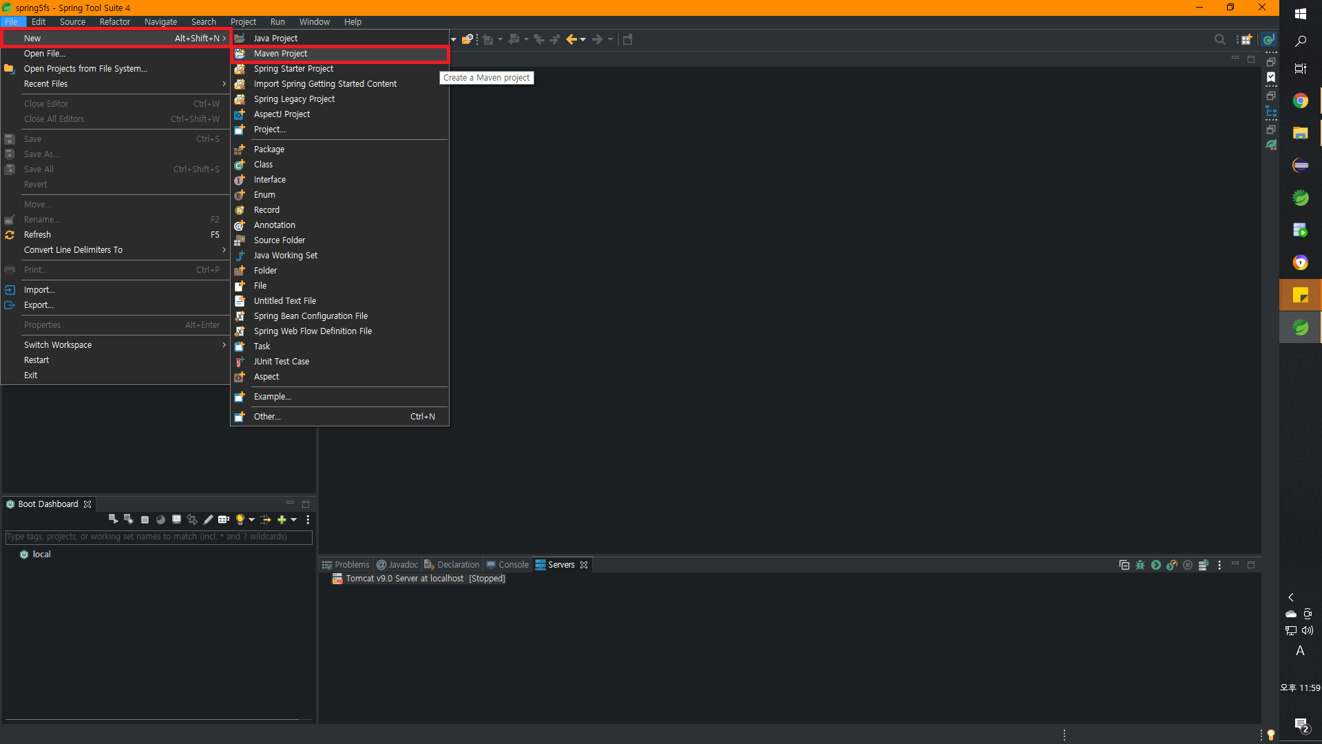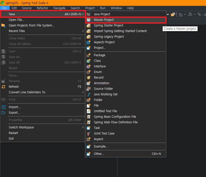 1. Spring Tool Suite4를 실행 후 상단 메뉴바에서 File > new > Maven Project 를 선택합니다.