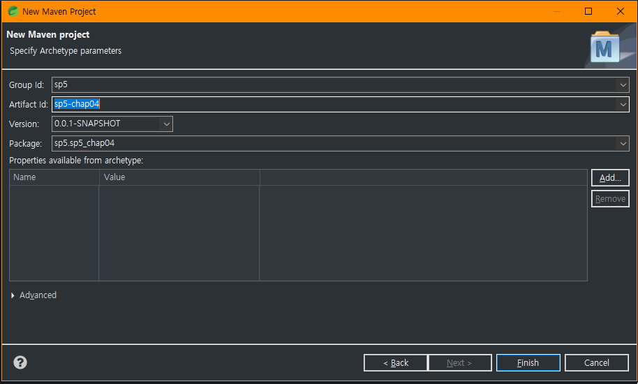4. Group Id, Artifact Id를 작성하고, Finish를 눌러 생성합니다.